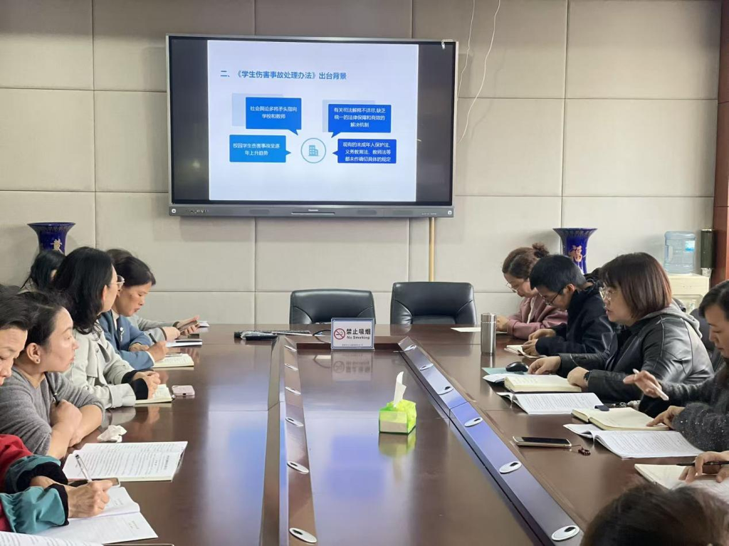 会上,许蕾书记领学《学生伤害事故处理办法》。她结合文件出台背景与核心要义,从学生伤害事故的责任认定、处理程序等关键条款入手,通过典型案例剖析,详细解读了班主任在日常班级管理、学生矛盾调解等场景中应履行的安全管理职责与风险防范要点。